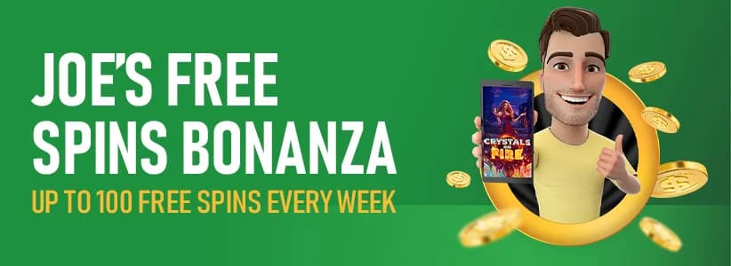 Joe’s giving you up to 100 Free Spins to use on Crystals on Fire every single week when you deposit $30 or more.